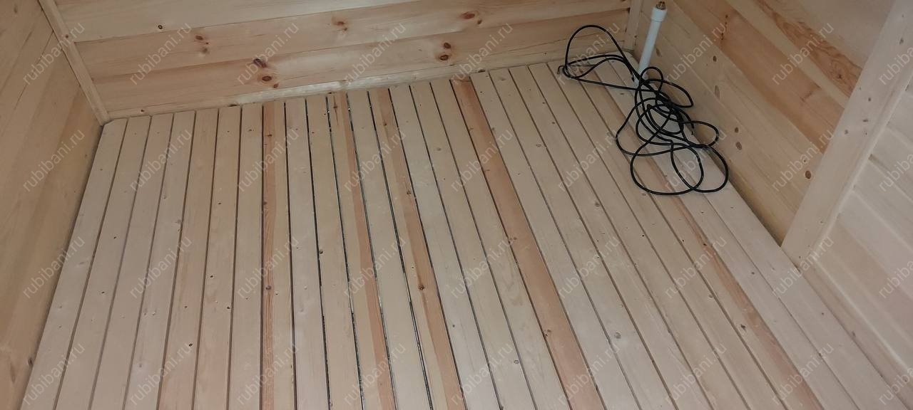 Пол чистовой выполнен из шпунтованой доски камерной сушки толщиной 27 мм