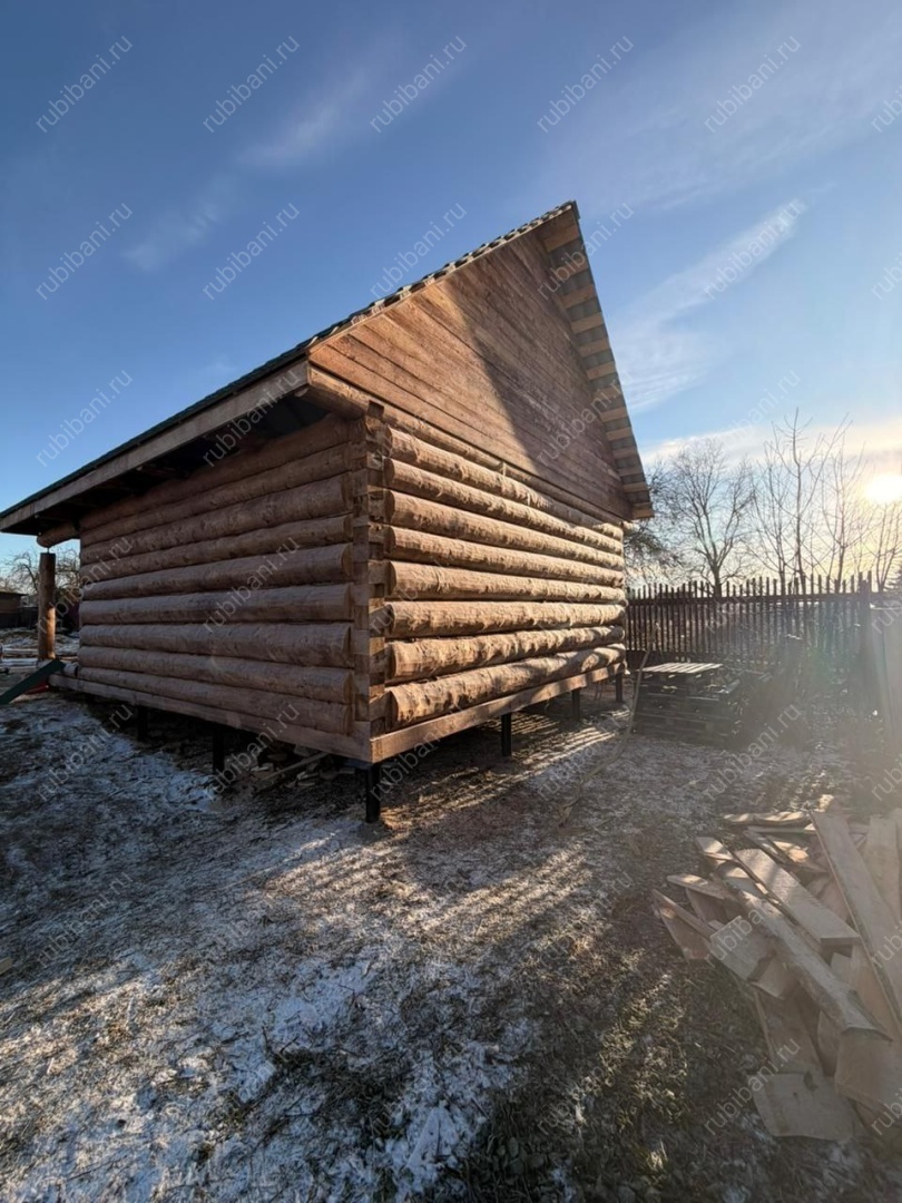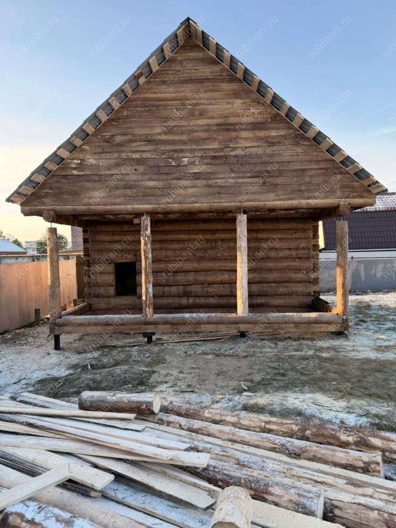 - Сруб бани — пятистенок (планировка свободная) из бревна хвойных пород древесины (сосна, ель) диаметром 220-300 мм — внутри тесанный (полулафет)